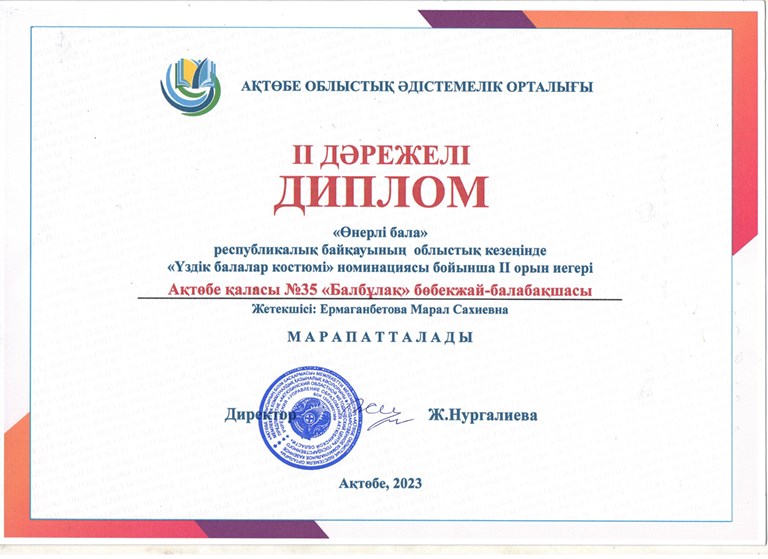 Ақтөбе облысы, Ақтөбе қаласы, Астана ауданы, Жаңақоныс тұрғындар алабы, №35 «Балбұлақ» балабақшасы МКҚК бойынша «Өнерлі бала» республикалық балалар шығармашылығы байқауына «Асатаяқ» аспаптар биімен қатысып облыстық деңгейден «Үздік балалар костюмы» номинациясымен ІІ орын дипломын иеленді