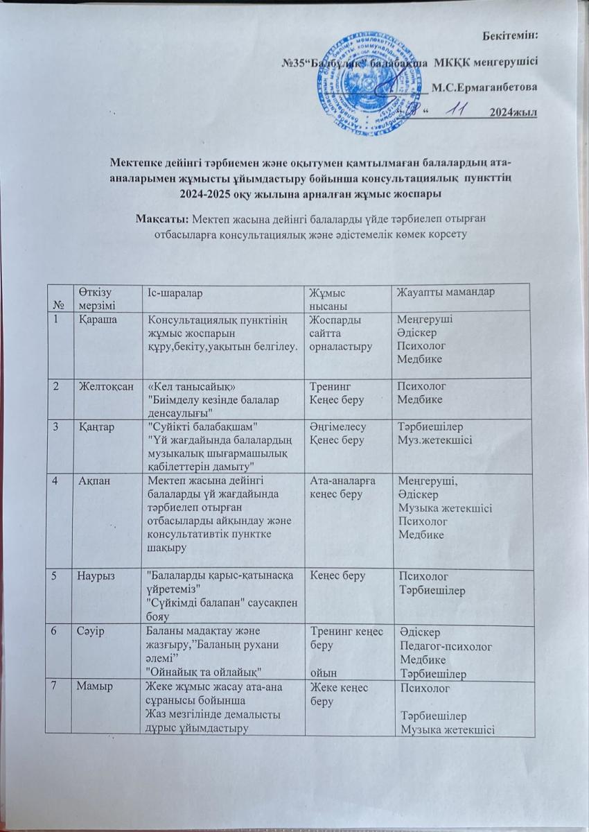 №35 «Балбұлақ» балабақшасы МКҚК жанындағы кеңес беру орталығына Дара бала арқылы кезекке қою туралы келген ата-анаға психолог Байтлеуова Г. кеңес беріп, сұрақтарға жауап берді.